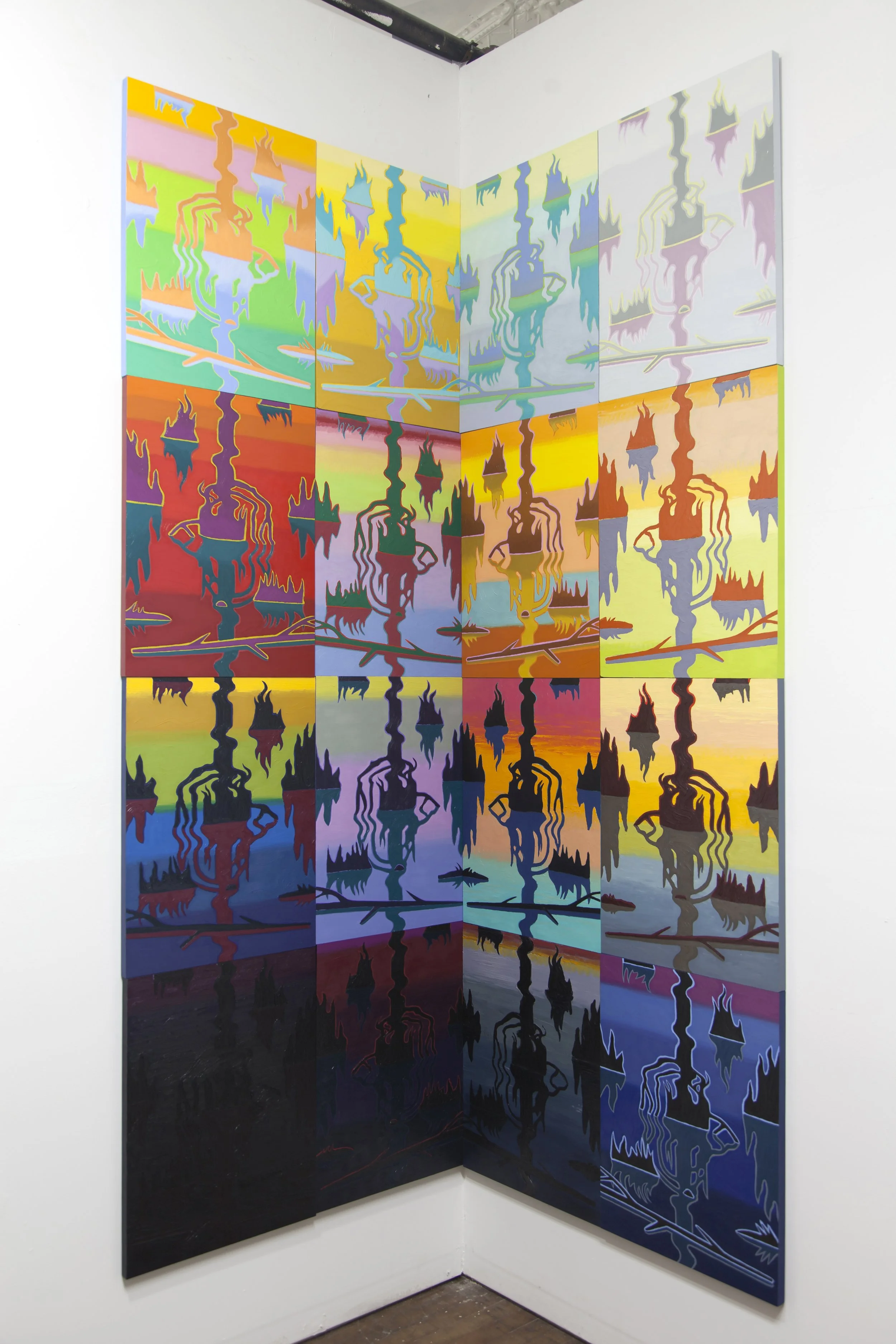 Swamp Shimmer, 16 panel corner arrangement, 2016-18, oil on panel, 96" x 72"